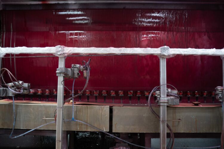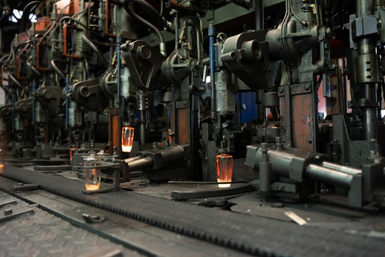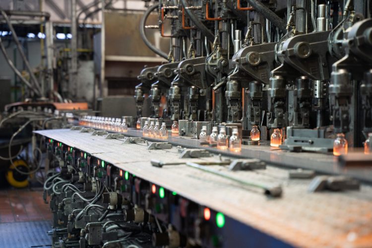 The place where the bottles are made is magical: the glass which is still warm and liquid flows into the mould, then appears on the conveyor belt – the heat of the glass emits an impressive red colour – and gradually cools.
