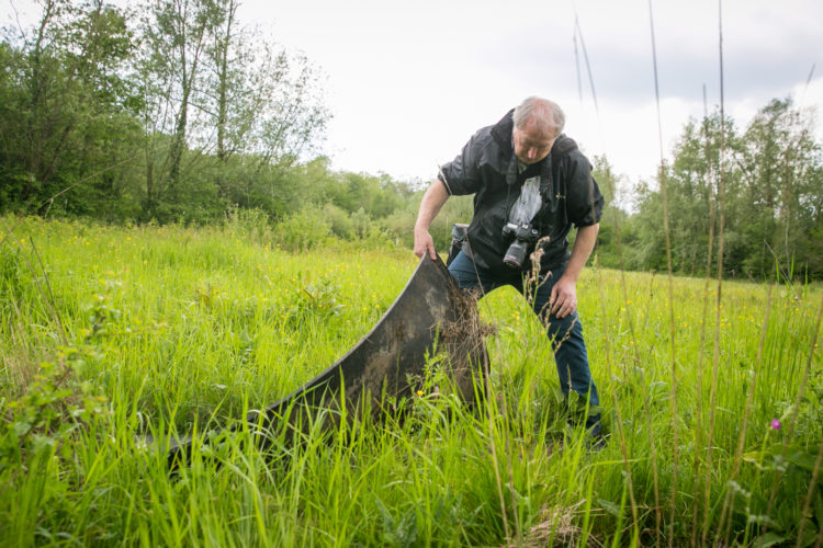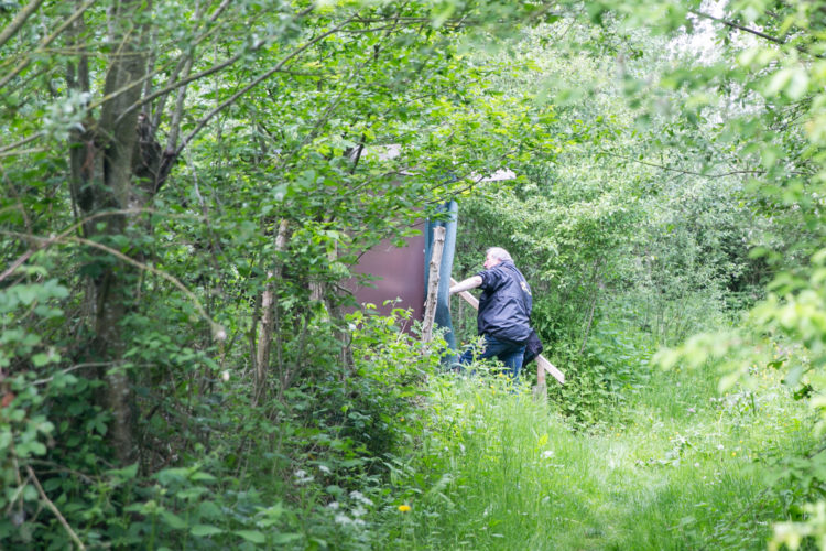 The agreed meeting time was 2pm at the Labuissière lock, in the municipality of Merbes-le-Château. There, I am greeted by a volunteer. He leads me to the Natagora Haute-Sambre Nature Reserve, with him on his motorbike and me following by car. The Natagora logo is emblazoned on his jacket. I park up behind a house and a man, dressed in a khaki gilet, emerges from a lookout.