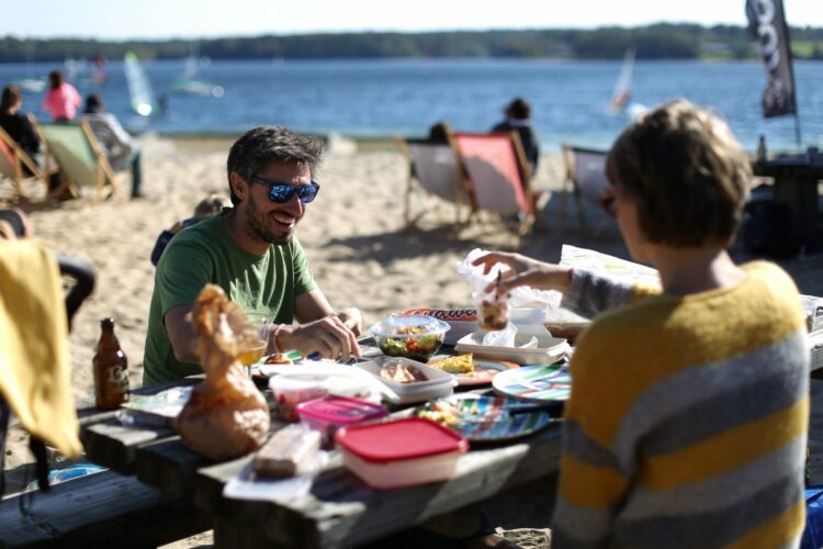 Naast watersporten vind je op het strand ook een bewaakte zwemzone, twee houten speeltuigen, een bar en, iets origineler, een bibliotheek, ingericht in grote koffers. “Iedere zondag in de grote vakantie kwam er iemand verhalen vertellen. Dat zijn heel gezellige momenten.”
