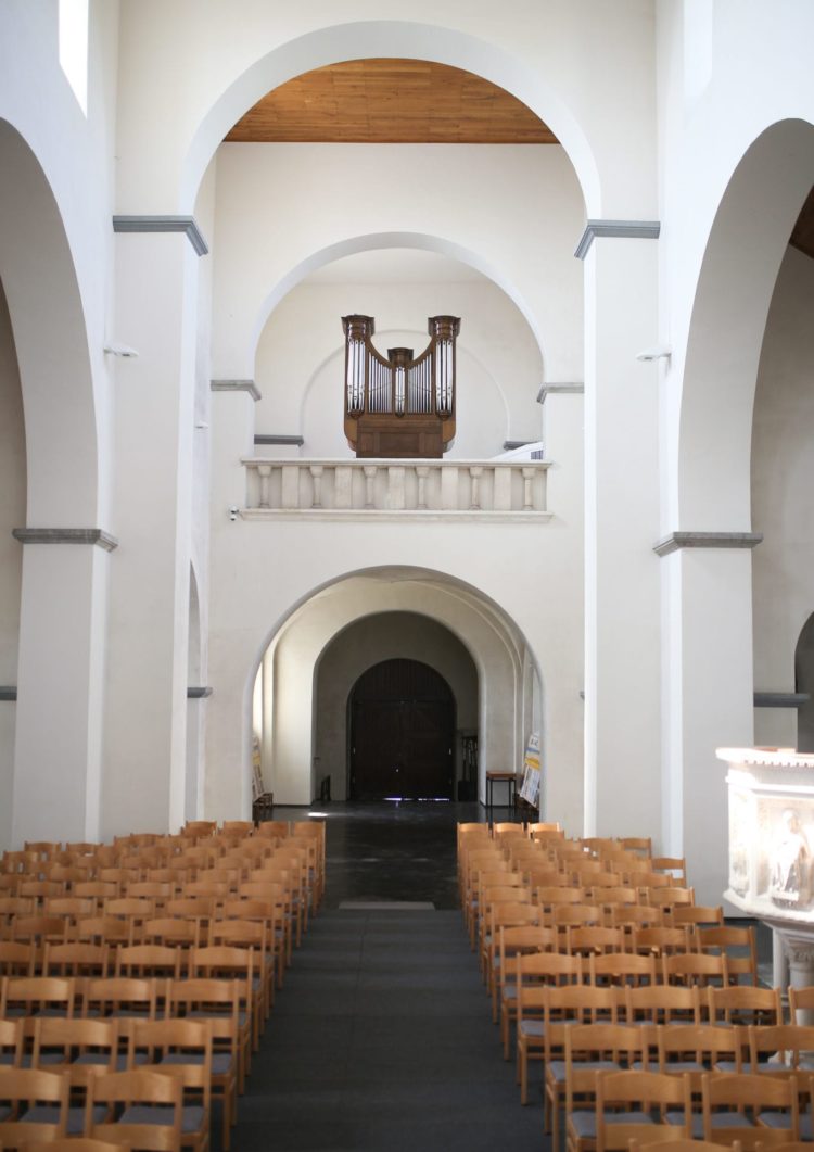 Binnen is niets bijzonders te zien. De muren zijn wit, de ramen klassiek en het plafond is bekleed met houten latten. Overeenkomsten met de vertrouwde collegialestijl zijn hier ver te zoeken. “Hier heerst een kale, zielloze sfeer,” zegt Laura, die de kerk komt bezoeken. En toch maakt die leegte ook haar hoofd leeg.